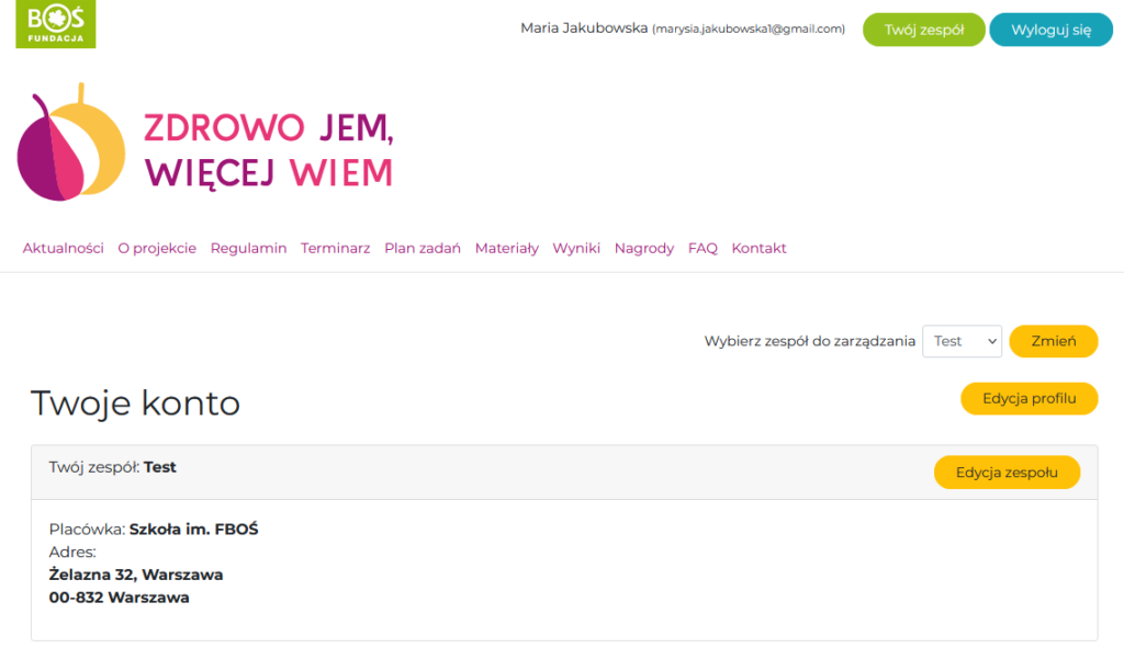 Niezależnie od liczby zarejestrowanych zespołów logowanie jest takie same. Żeby przełączyć się pomiędzy kontami zespołów należy po zalogowaniu przejść do zakładki TWÓJ ZESPÓŁ, a następnie na rozwijanej liście zaznaczyć odpowiedni zespół i potwierdzić wybór przyciskiem ZMIEŃ.